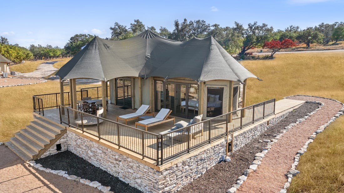 Experience the Hill Country's Finest Glamping Retreat. Escape to 34 acres of rugged beauty at Texas’ premier luxury destination. Located just minutes from Fredericksburg’s iconic wineries, our designer tents offer the perfect blend of wild Texas scenery and high-end resort comfort. Each retreat features a plush king bed, spa-inspired bathrooms, and full climate control (AC/Heat). Whether you're seeking a romantic "slowcation" or the ultimate wine-tasting basecamp, wake up to panoramic sunrises and unwind under a blanket of stars. Your luxury Hill Country escape starts here.