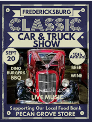 10th Annual Fredericksburg Classic Car/Truck Show en el Historic Pecan Grove Store comienza al mediodía. El mayor espectáculo de coches y camiones de Texas. Entrada gratuita al público con una donación de 3 latas de comida o donación en efectivo para el banco de alimentos local. 75 de los mejores coches clásicos y camiones.