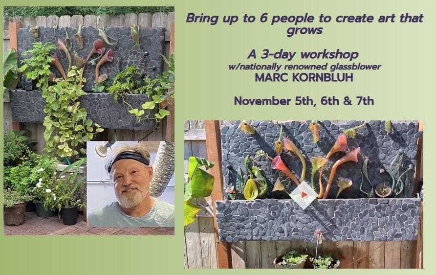 Durante su visita, Kornbluh dirigirá un taller de "Construir y soplar" de tres días (del 5 al 7 de noviembre), en el que los participantes crearán su propia maceta hidropónica alimentada por energía solar y soplarán flores de vidrio para la fuente incorporada. La inscripción al taller está cerrada, pero los observadores pueden ver y comprar las instrucciones y encargar las flores de cristal para construirlas por su cuenta. Es necesario inscribirse previamente.