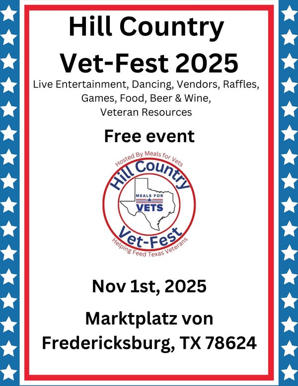 Meals for Vets se complace en anunciar su segundo evento anual de recaudación de fondos, Hill Country Vet-Fest. Con buena comida, cerveza y vino, casas de rebote, pintura de caras, un montón de rifas, juegos, vendedores, recursos veteranos, música en vivo y baile durante todo el día y la noche. Venga a un evento gratuito lleno de diversión apoyando una gran causa. Para obtener más información, oportunidades de patrocinio o donaciones, no dude en ponerse en contacto con nosotros en (830) 992-3375 o info@mealsforvets.org.