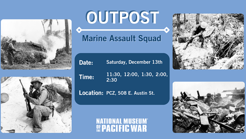 Acompáñenos en la Zona de Combate del Pacífico, en la calle Austin, a las 11:30, 12:00, 13:30, 14:00 y 14:30. Los puestos avanzados son gratuitos y abiertos al público, ¡no se necesita entrada!
