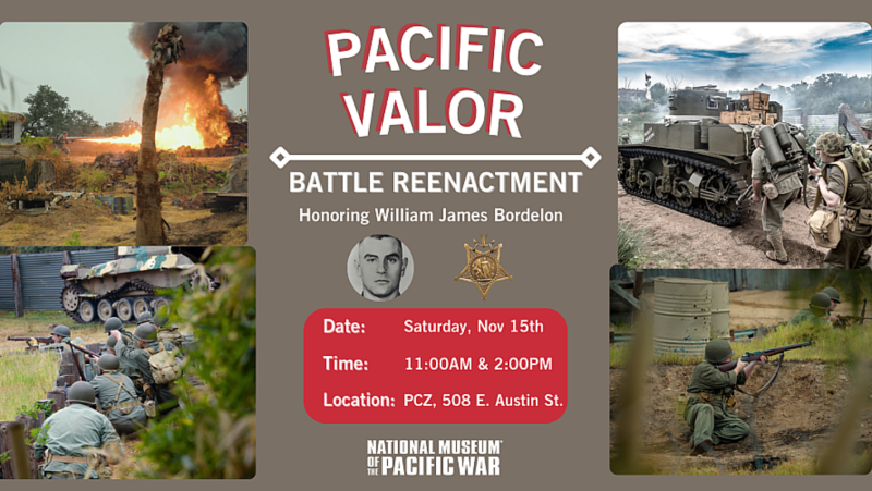 Pacific Valor, la batalla viviente de historia emblemática del Museo Nacional de la Guerra del Pacífico, sumerge a los asistentes en las historias reales de los galardonados con la Medalla de Honor durante la Segunda Guerra Mundial. Este programa transportará a los invitados a la pequeña isla de Tarawa, donde el sargento primero William James Bordelon dio su vida luchando como demoledor contra los atrincheramientos japoneses en noviembre de 1943.