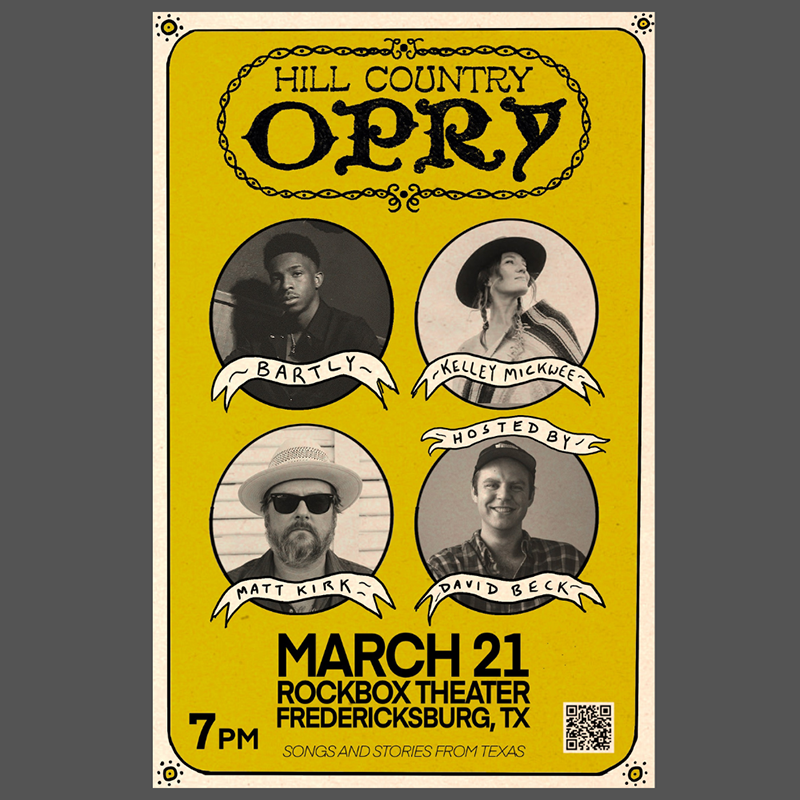 The Hill Country Opry is a new music series coming to Rockbox Theater. Seeking to honor the rich musical history of the Hill Country and beyond, host David Beck and his top-notch house band will lead an evening of top tier special guests, DJ Bartly - recently appeared on American Idol, Kelley Mickwee, and Matt Kirk.